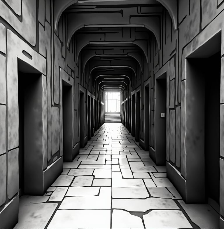 From there, three paths could be taken: straight down the vertical corridor (the north-south axis, the central of the three), the doors to the left and right were: 4—where the gold of the invaders was stored, gold they tried to take during the war but failed; 36—where a generator powered by solar panels on the roof was kept (the house also had backup power from the town grid); 10—where fossil fuel was stored, now obsolete; 22—for tools and equipment to tend the gardens. Then 35—where heavy winter clothing was kept, enough for a battalion, though Eva used only a fraction, the last of her clan. The day of the accident she lost her husband and children. 11—where canned food was stored, just in case, including produce preserved under strict methods; vegetables, fruit, even meat. Then 40—nearly at the center, with a well of fresh, drinkable water for the garden and house. 17—the room of memories, holding the family’s toys and other personal items. Next, 25—one of the largest rooms, with about twenty bunks. 6—formerly the strategy and command center. And lastly, the dead-end room, odd-numbered 33—a torture chamber with tools from long-gone empires.